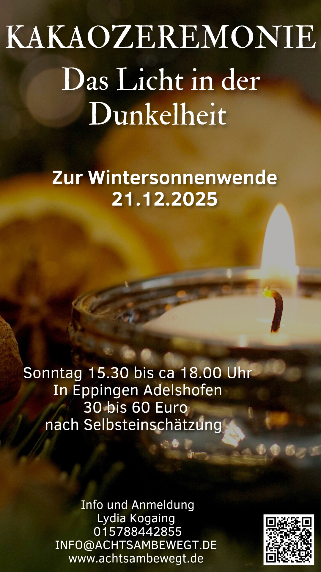 Der Rohkakao den ich bei der Kakaozeremonie am Samstag anbiete ist genau richtig dafür. Die volle Kraft der Kakaobohne. Die Kakaobohne enthält Theobromin ein anregender und entspannender pflanzlicher Stoff der unseren Glückshormon Serotonin sehr ähnlich ist. Außerdem enthält Rohkakao auch viel Magnesium und gesunde Fette . Die meisten von uns kennen die glücklich machende und nährende manchmal tröstende Wirkung von Schokolade. Im Rohkakao ist die Konzentration dieser Stoffe um ein Vielfaches höher. Und so wollen wir uns am Samstag mit Rohkakao sowie mit sanften Bewegungs- und Enstpannungsübungen nähren und stärken um dann in die Dunkelheit zu tauchen. So können wir erfahren wie wichtig und nährend auch die Stille und die Dunkelheit dieser Jahreszeit sein kann.